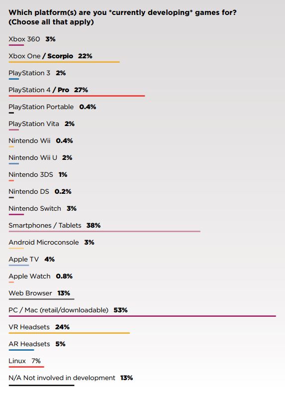 Looking ahead, this pattern of interest seems likely to continue: 52 percent of respondents said they plan to release their next game on PC/Mac, and 34 percent said smartphones/tablets. 29 percent said PS4/4 Pro, and 23 percent said VR headsets. 22 percent, meanwhile, said they expected to release their next game on Xbox One or the revamped version of that console, currently codenamed Project Scorpio, which is expected to release next year.