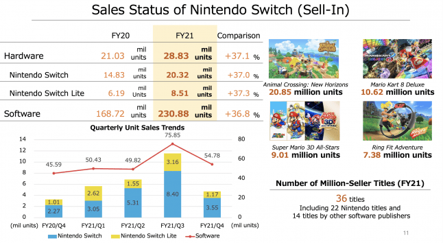 Titles like Animal Crossing: New Horizons (20.85 million sales during FY21), Mario Kart 8 Deluxe (10.63 million sales during FY21), and Ring Fit Adventure (7.38 million sales during FY21), were some of the biggest sellers during the fiscal year.