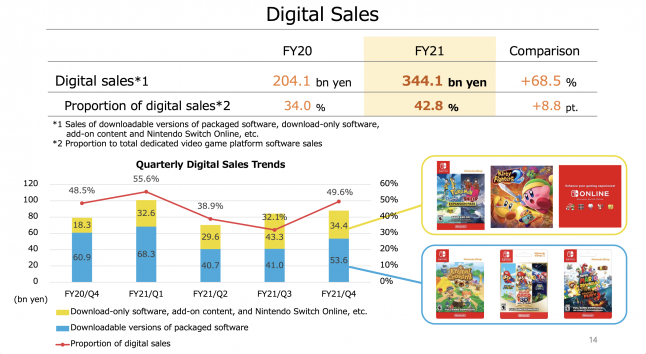 In terms of software, digital sales accounted for 42.8 percent of all software sales — an increase of 8.8 percent year-on-year. The company explained that sales of download-only titles and sales related to Nintendo Switch Online were also “steady,” helping to bring digital sales revenue to 344.1 billion yen ($3.1 billion) — an increase of 68.5 percent year-on-year.