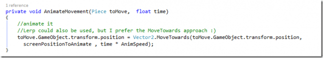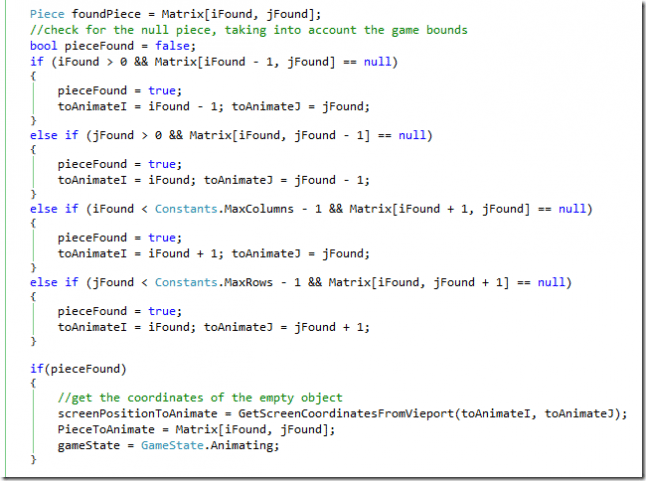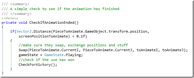 On the animating state we also call the CheckIfAnimationEnded method. This method checks if the sprite has completed its animation by comparing the distance of the two transforms. If this is the case, then we call the Swap method to have the moving piece moved properly to the new location plus for it to acquire the relevant current I and J properties. We then switch to the playing state and we also check if the user has won!