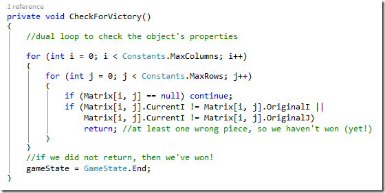 The CheckForVictory method checks all Pieces to determine whether all of them are in the correct positions. If one piece is found not to, then the method returns immediately. If all of them are in the correct positions, then the game transitions to the ending state.