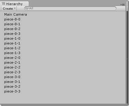 Our hierarchy is pretty simple. We have the orthographic camera and our puzzle pieces (which we could also store as prefabs).