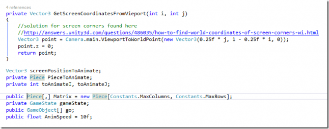 The GetScreenCoordinatesFromViewport method returns a Vector3 with the world location for each object. The way it works is this; since it’s scanning the viewport, you can imagine the lower left corner to have coordinates (0,0) and the upper right (1,1). So, for instance, a puzzle piece in the second row and in the third column would have coordinates (0.5, 0.75). Below the method we declare some helpful fields and objects for our game.