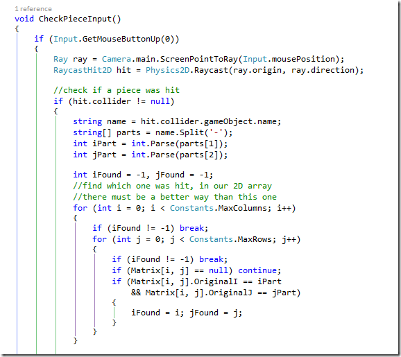 The CheckPieceInput, running on the playing state of our game, does a raycast upon each player’s tap in order to determine the object that was hit. It loops through all objects in the 2D array to find the correct one. [A prettier way would probably be to attach a MonoBehavior script to each Sprite and find its corresponding Piece reference via its help, but the implemented approach works, nonetheless].