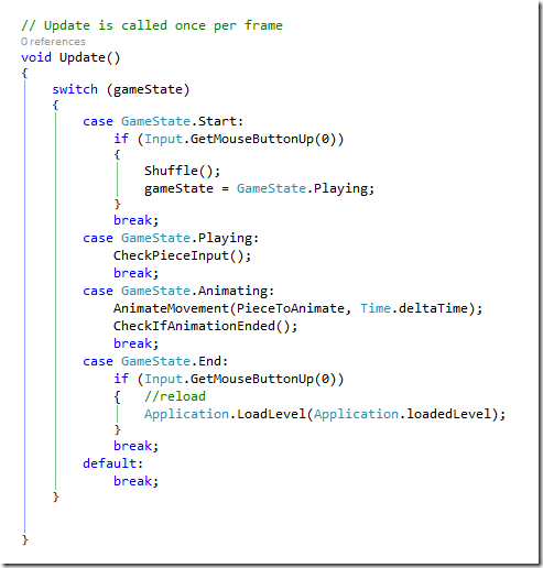 Our Update method checks the game state. If we are in the start state and a tap occurs, we shuffle the available pieces and transition to the playing state. If we are in the playing state, we handle the player’s tap events. We also have an animating state, where our piece transitions from the original position to the blank one and finally, an ending state where the user can tap in order to restart the game.