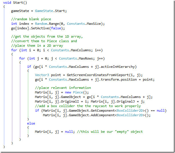 At first, we set the state of the game and select a random piece to be blank. We set it as inactive. Then, we take the 16 sprites (imported in a 1D array) and insert them in a 2D array via the Piece class, by assigning all the necessary properties. Plus, we set their positions and add a BoxCollider2D component, if they don’t have one. Last, we set the blank piece to be null.