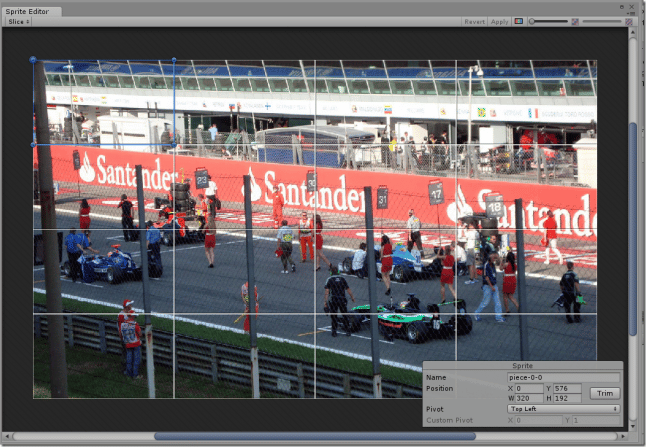Once we set the sprite mode to multiple, we can use the sprite editor to ‘slice’ our image. Since the image does not have an alpha channel, we’ll use Grid slicing. Moreover, we’ll name our exported sprites with a name that contains their location information (i.e. piece-0-0 => this implies that the sprite’s “correct” location is on the top left corner of our game). Plus, we’ll set each sprite’s pivot point to be top left, since this will help us in positioning.