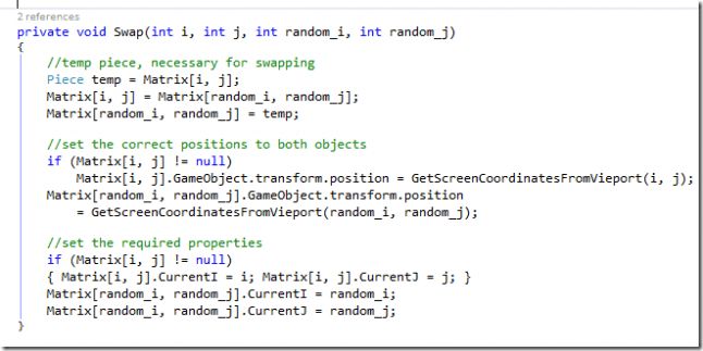 In our game, we’ll use a Piece class that contains a) our GameObject (the sprite) and b) relevant information about its current and “correct” positions. Entire code was written in Visual Studio (check out the free Community edition here and the Microsoft Visual Studio Tools for Unity here).