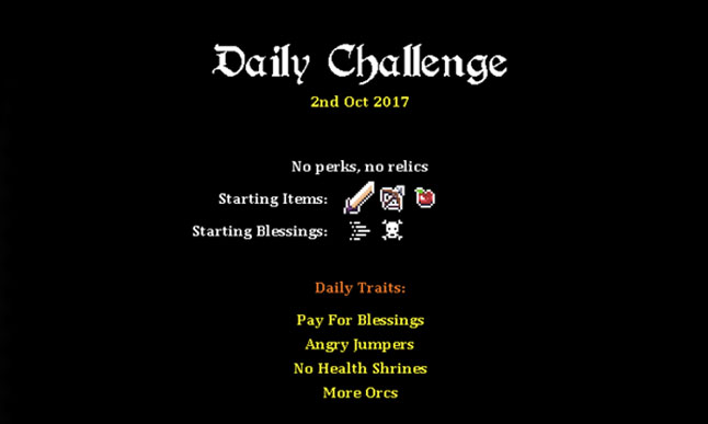That is, a shared seed across all copies of the game (although separate seeds for Steam and PS4) that everyone gets a shot at, before it rolls over to a new seed 24 hours later. Throw in a leaderboard, and you can achieve short-lived fame knowing that the conditions were no more favorable or adverse for you than anyone else.